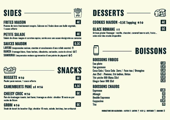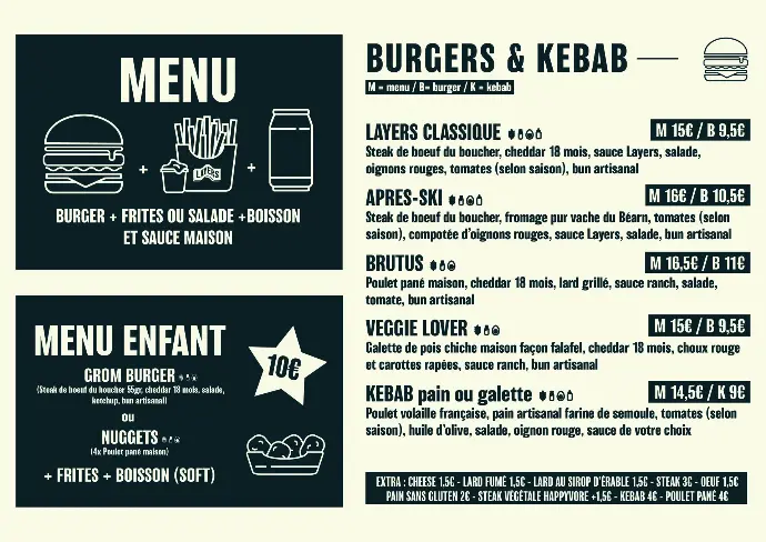 Layers vous cuisine une streetfood de qualité avec des produits frais que nous nous procurons auprès de nos partenaires locaux. Retrouvez à notre carte des burgers de boeuf, poulet ou végétarien, Kebab avec des frites maison ou des crudités pour plus de légèreté. Boissons régionales. Vous restera-t-il de la place pour un café fraichement moulu accompagné d'un de nos desserts maison : cookies, cheesecake, glace romane ?